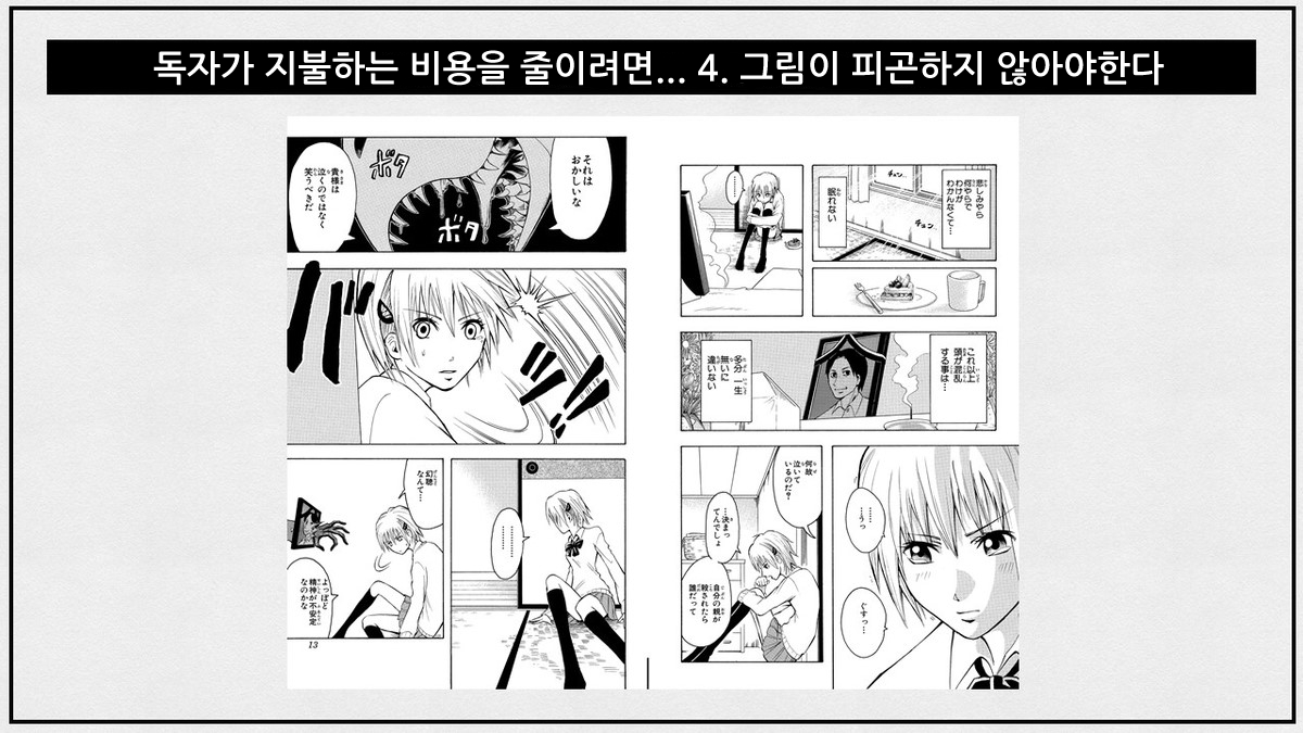 그리고 만화를 읽으면 뇌를 사용하는 거니까 피곤해져요. 눈도 피곤해지겠죠. 페이지를 넘기는 손도 피곤해져요. ‘재미만 있으면 페이지를 넘기는 노력도 상관없고, 뇌도 막 흥분될거야’라고 생각할 수도 있지만, 그렇진 않아요. 이건 나중에 자세히 설명하고 일단 돌아가봅시다.